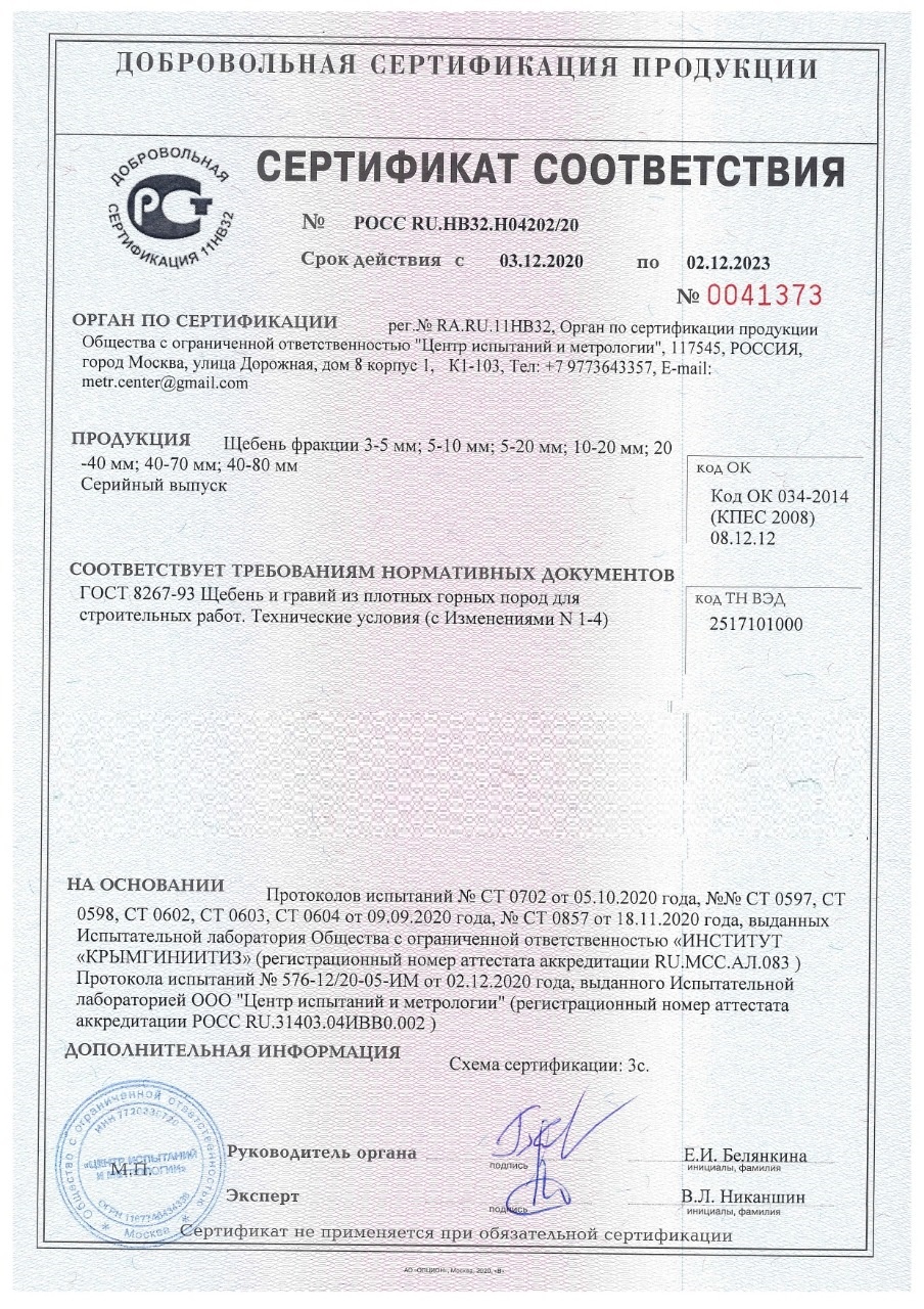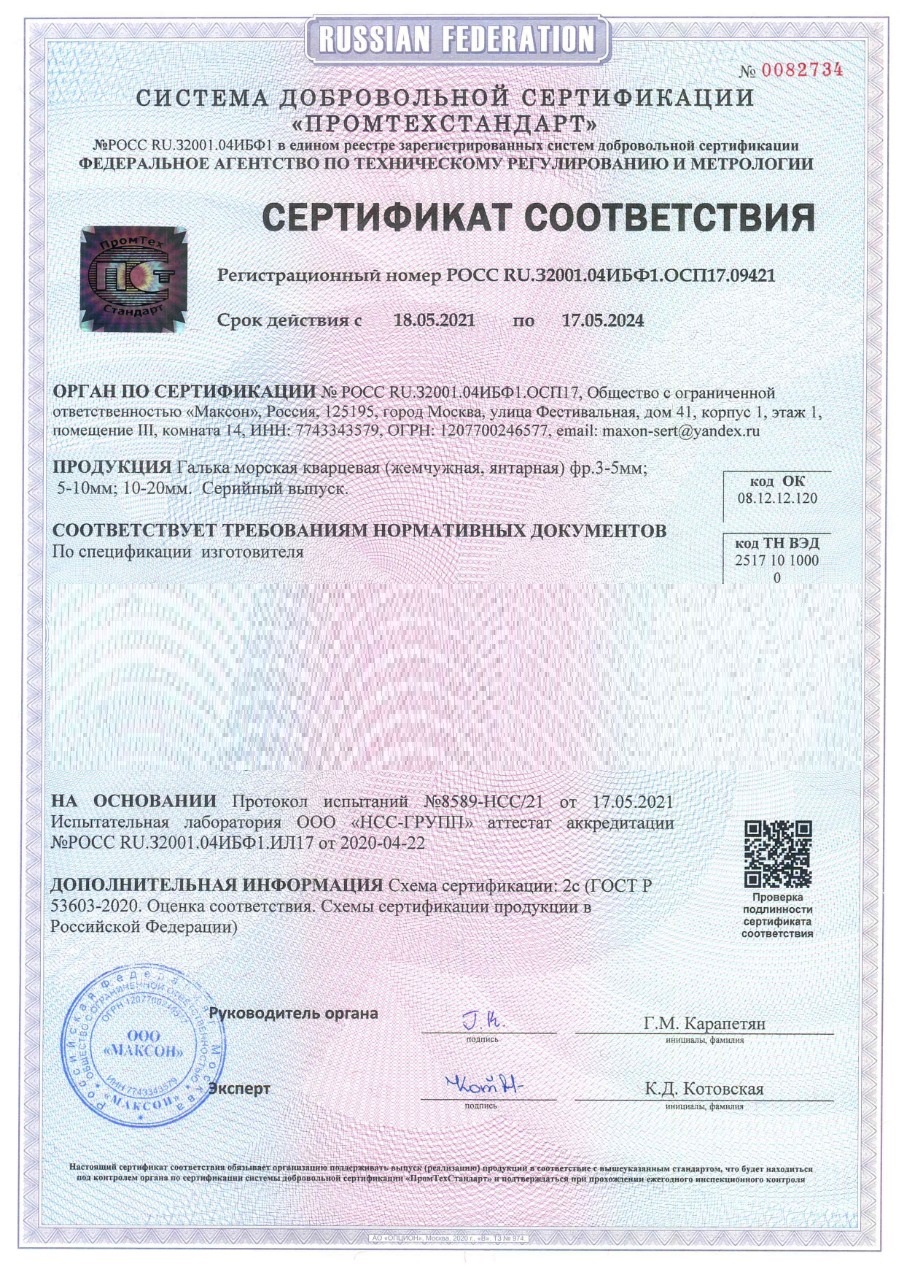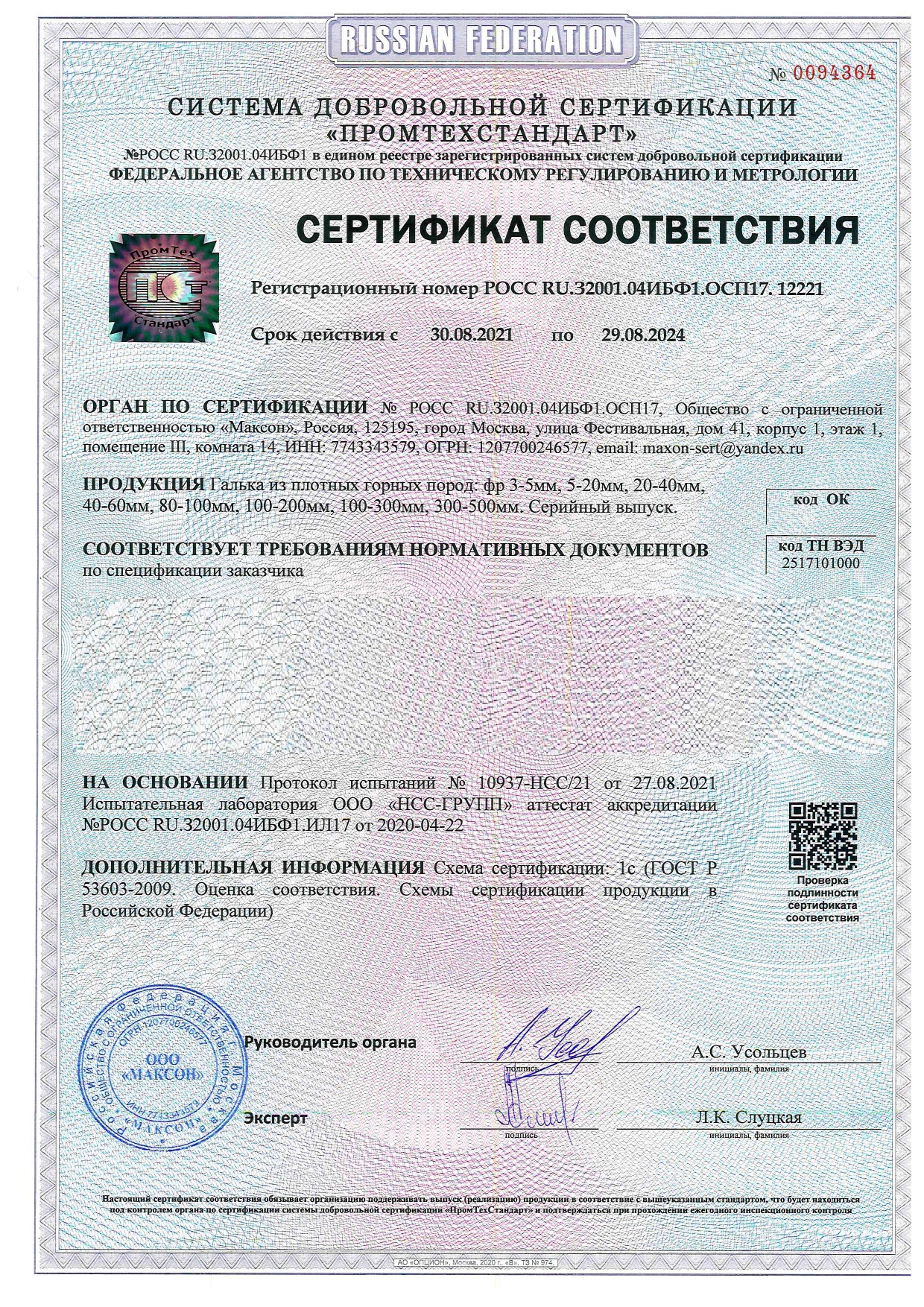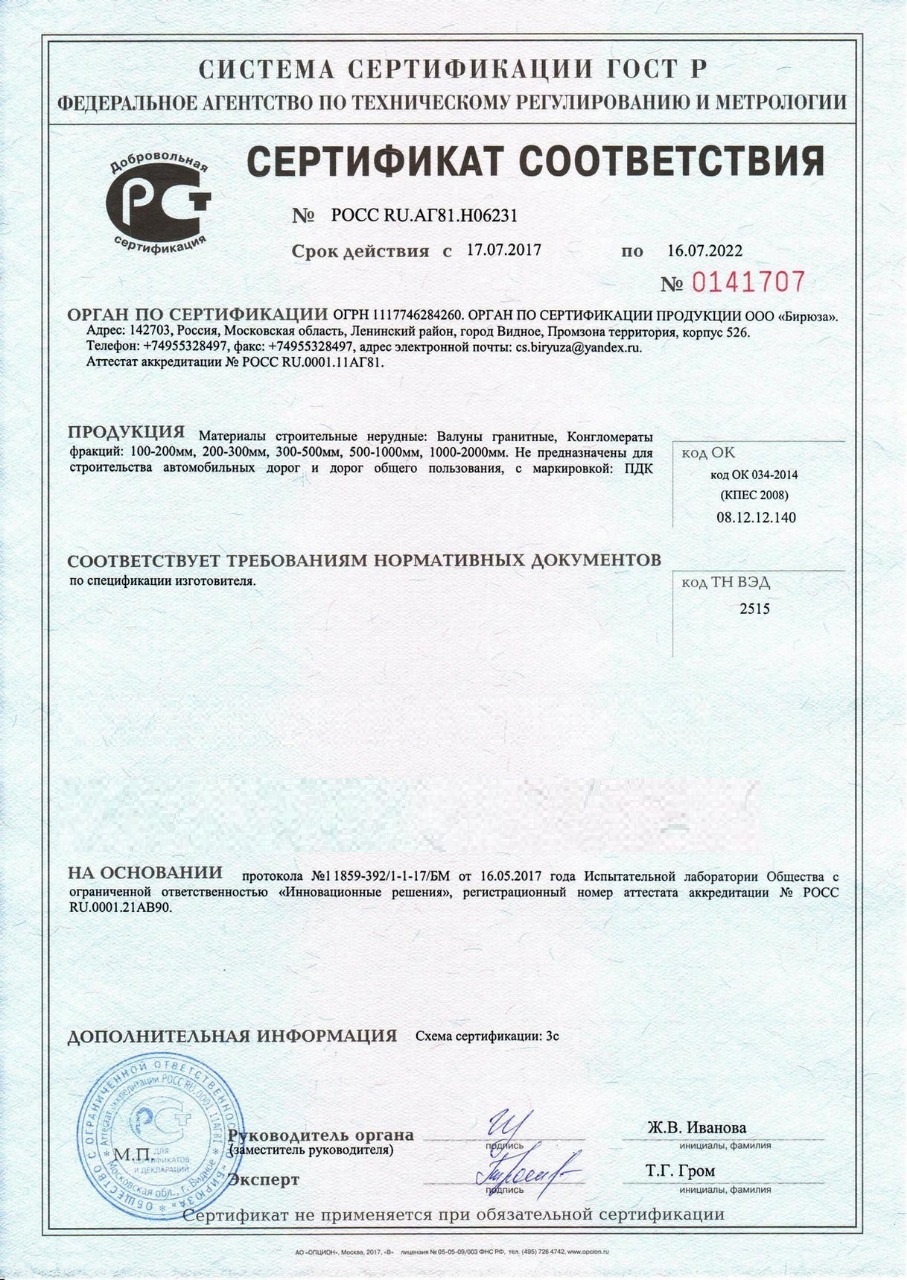 Сертификат соответствия на гальку, бут, булыгу в Подольске