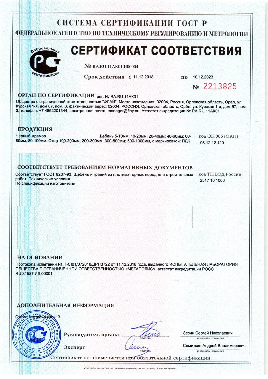 Сертификат соответствия – документ, подтверждающий соответствие продукции требованиям качества и безопасности, установленными для нее действующими стандартами и правилами. Наш камень, который Вы сможете заказать с доставкой в Подольске , обладает всеми необходимыми документами для реализации и при необходимости могут быть предоставлены все необходимые подтверждающие документы при поставке.